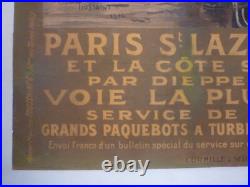 Affiche ancienne chemin de fer Paris à Londres 1914. Petites restaurations dans les marges. Quelques restaurations et repeints dans l'image aux niveau des plis.